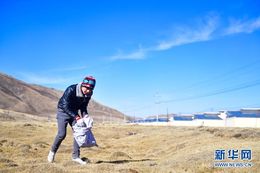 1月11日,隆亞(ya) 村牧民東(dong) 保在搬遷點周邊的草原上撿拾垃圾。新華社記者 張龍 攝