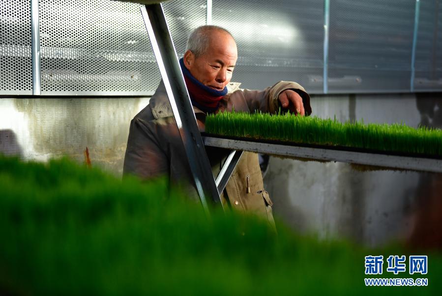 1月13日,在青海省果洛藏族自治州農(nong) 牧業(ye) 生態科技示範園,工作人員許宗倉(cang) 在查看牧草生長情況。新華社記者 張龍 攝