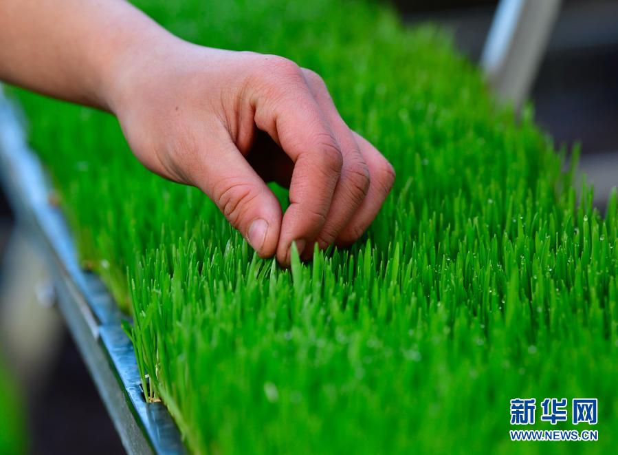 1月13日,在青海省果洛藏族自治州農(nong) 牧業(ye) 生態科技示範園,工作人員在查看牧草生長情況。 新華社記者 張龍 攝