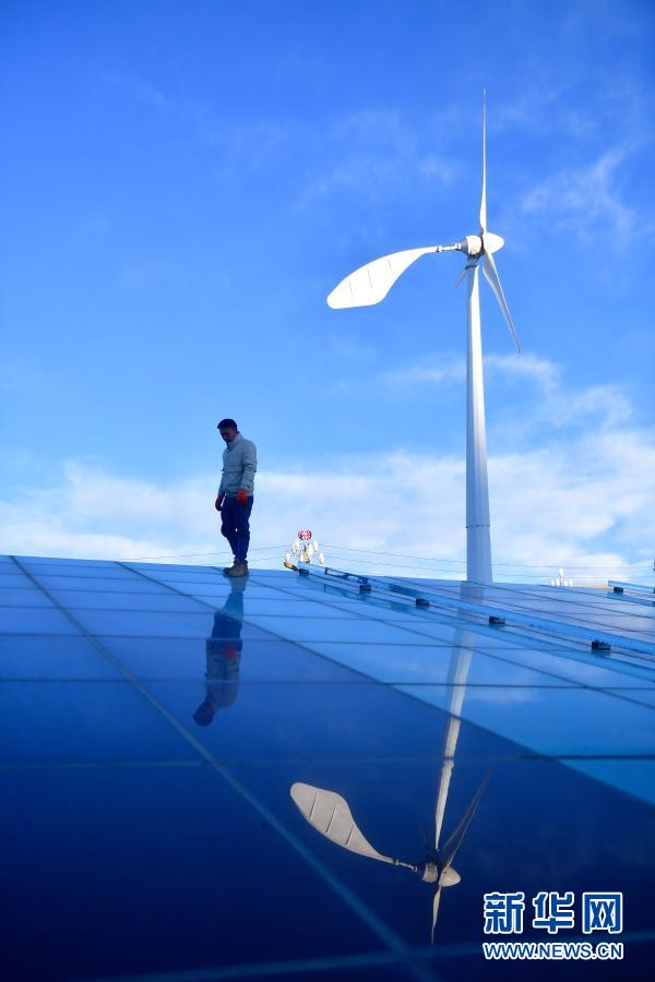 1月13日,在青海省果洛藏族自治州農(nong) 牧業(ye) 生態科技示範園,工作人員董誌強在查看大棚光伏板。 新華社記者 張龍 攝