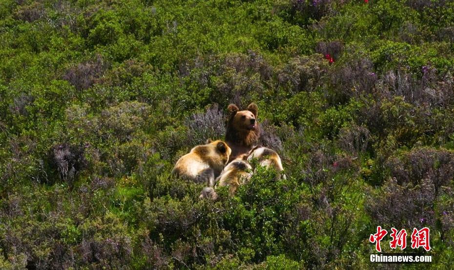 在四川省甘孜藏族自治州石渠縣蒙宜鎮蒙格村附近一處水草豐茂的山坡處拍攝時,偶然發現一隻棕熊媽媽曬著陽光浴給三隻小熊喂奶場景,棕熊媽媽喂奶結束後領著小熊寶寶們緩慢走向大山深處。[詳細] -