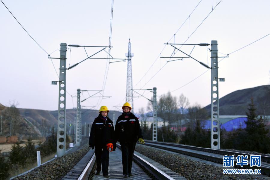 2月2日,在青藏鐵路公司西寧供電段哈爾蓋工區負責鐵路線上,郭勝強(左)與(yu) 羅露露在巡檢接觸網。新華社記者 張龍 攝