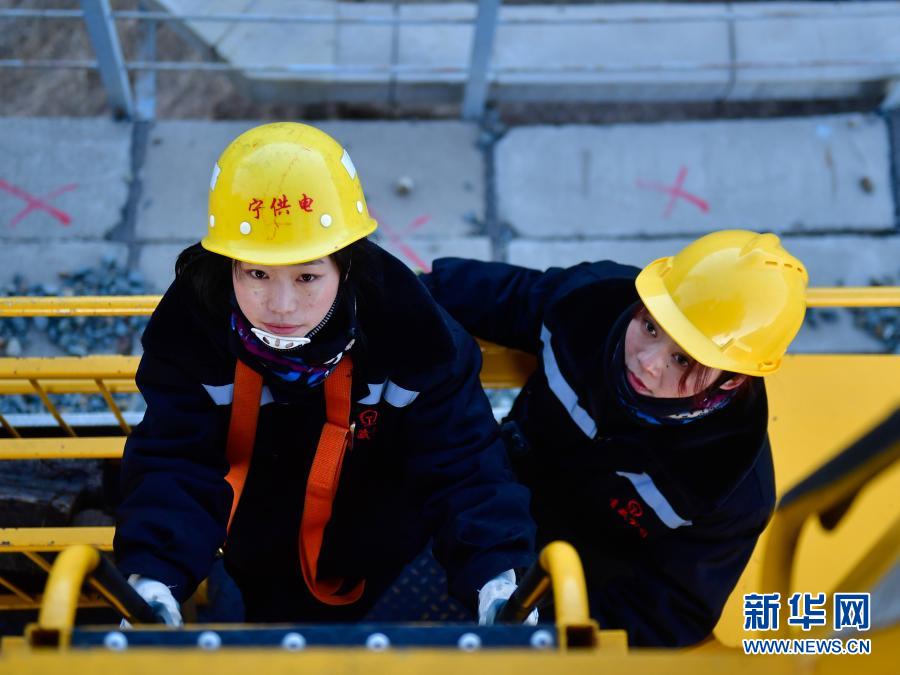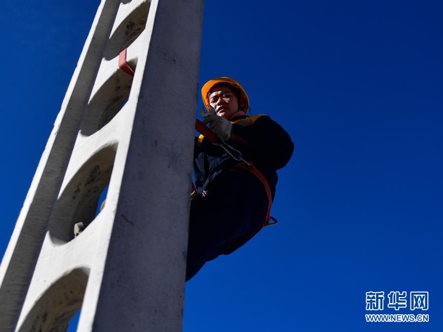 2月2日,在青藏鐵路公司西寧供電段哈爾蓋工區負責鐵路線上,羅露露在攀登接觸網支柱。新華社記者 張龍 攝
