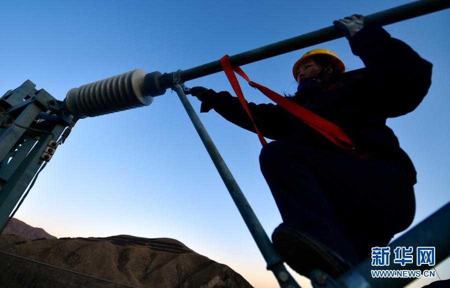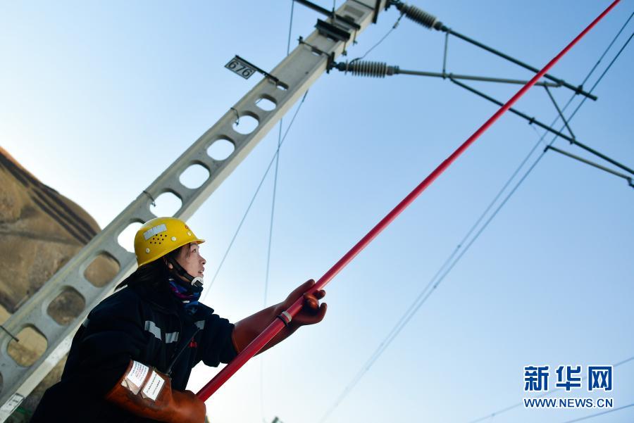 2月2日,在青藏鐵路公司西寧供電段哈爾蓋工區負責鐵路線上,羅露露在檢修螺絲(si) 。新華社記者 張龍 攝