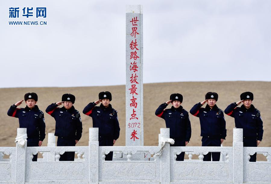 2月4日,沱沱河站派出所巡線民警在“世界鐵路海拔最高點”標誌碑前合影。新華社記者 張龍 攝