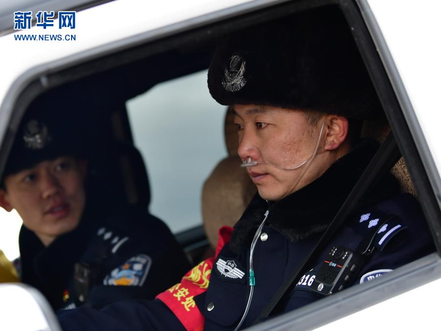 2月5日,沱沱河站派出所副所長蒲海春(右)在巡線途中出現高原反應後緊急吸氧。新華社記者 張龍 攝