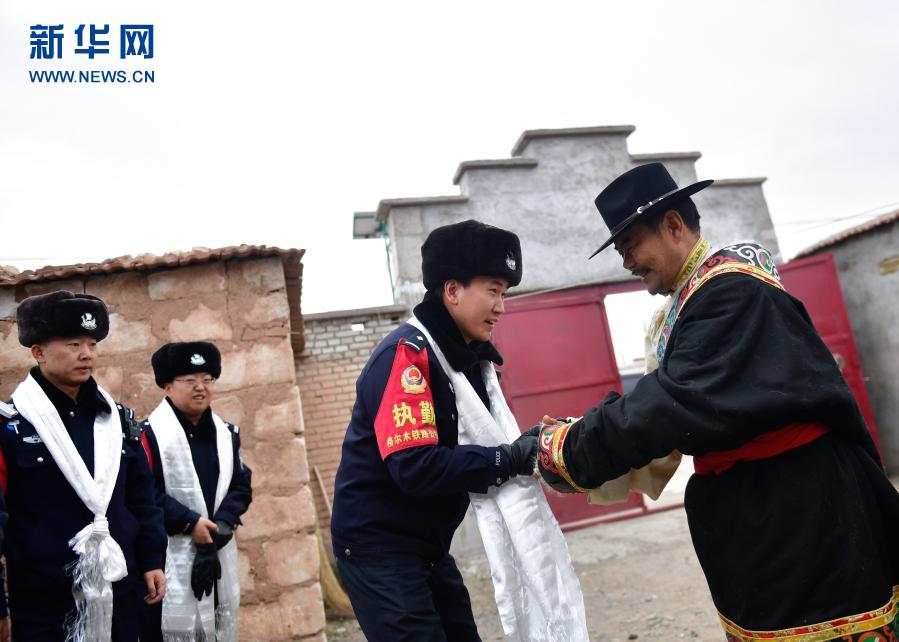 2月5日,沱沱河站派出所巡線民警到格爾木市唐古拉山鎮格日村義(yi) 務護路隊員革命花(右一)家中慰問時接受哈達。新華社記者 張龍 攝