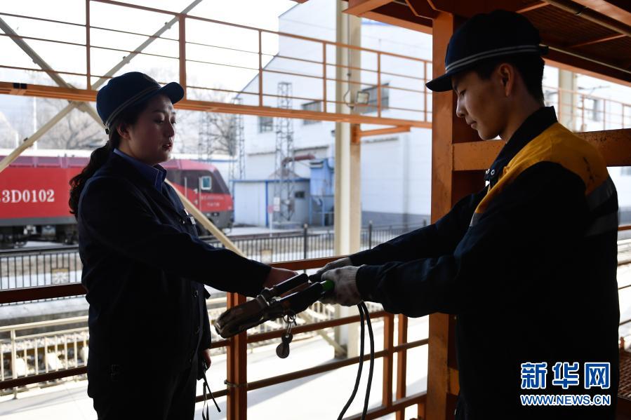 2月24日,在青藏鐵路公司西寧機務段整備車間,隔離開關(guan) 班組成員賀霞(左)在工作中。新華社記者 張龍 攝