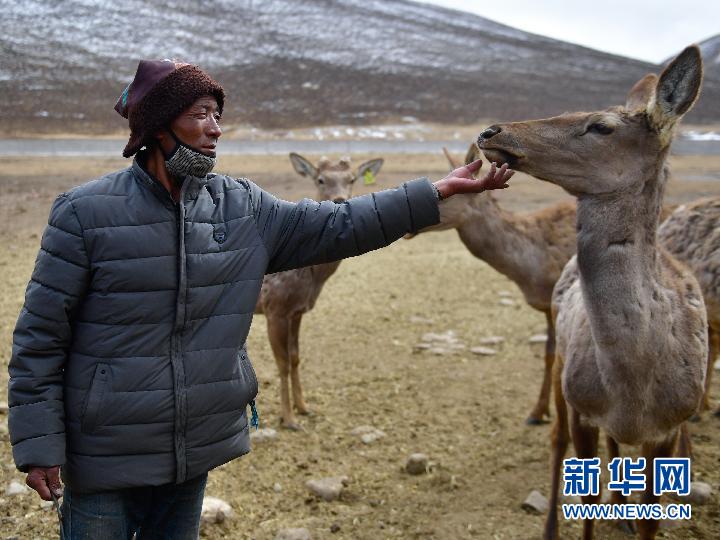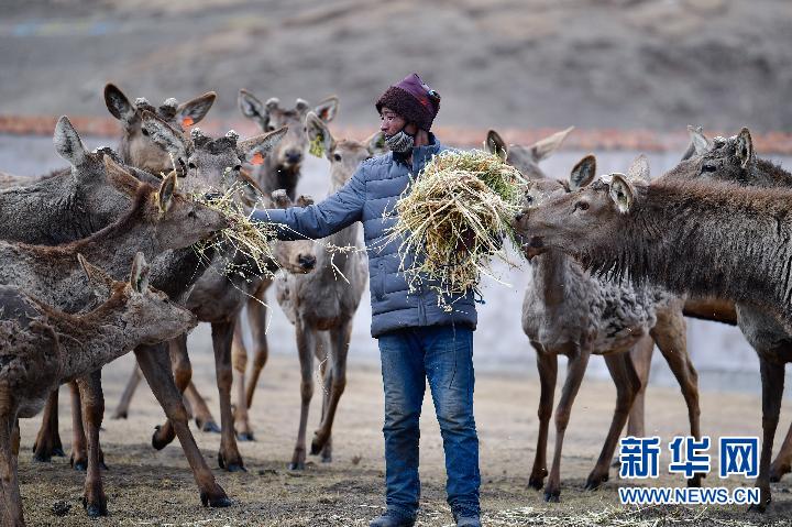 3月13日,甘德縣崗龍鄉(xiang) 恰不將村生態畜牧業(ye) 專(zhuan) 業(ye) 合作社村民在鹿場喂鹿。新華社記者 張龍 攝