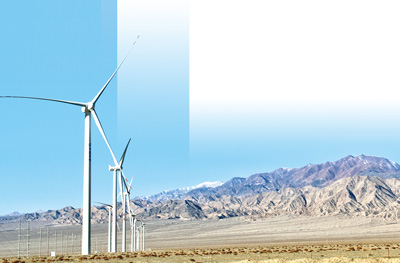 柴達木盆地上,巨大的風力發電機正在運轉。記者 薑峰 攝