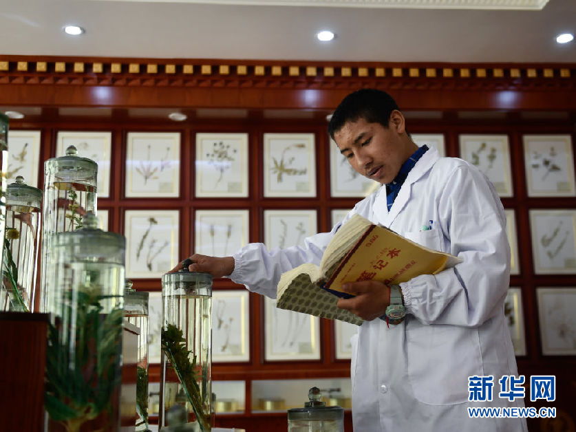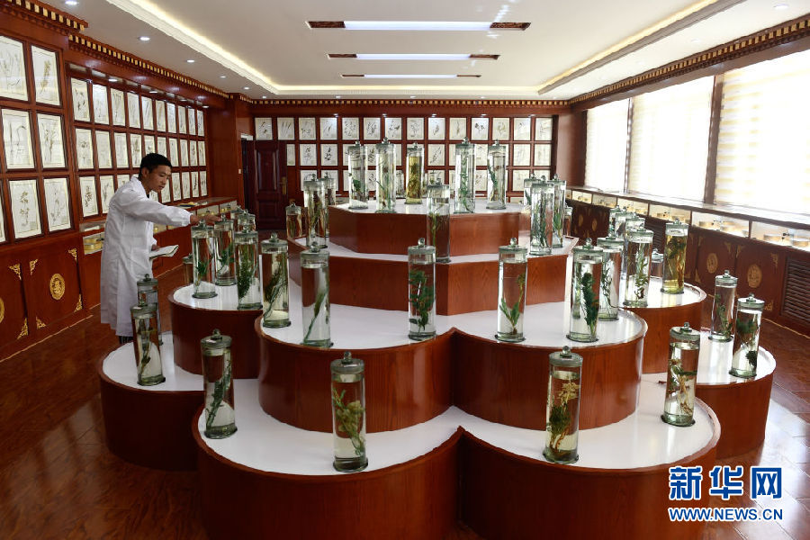 3月16日,在果洛藏族自治州職業(ye) 技術學校,2020級藏醫醫療與(yu) 藏藥專(zhuan) 業(ye) 學生華旦在草藥標本館內(nei) 辨認藥材。新華社記者 張龍 攝