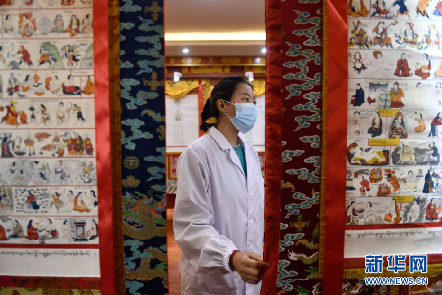 3月16日,在果洛藏族自治州職業(ye) 技術學校,2020級藏醫醫療與(yu) 藏藥專(zhuan) 業(ye) 學生才讓措通過藏醫典籍唐卡學習(xi) 。新華社記者 張龍 攝