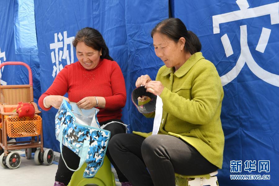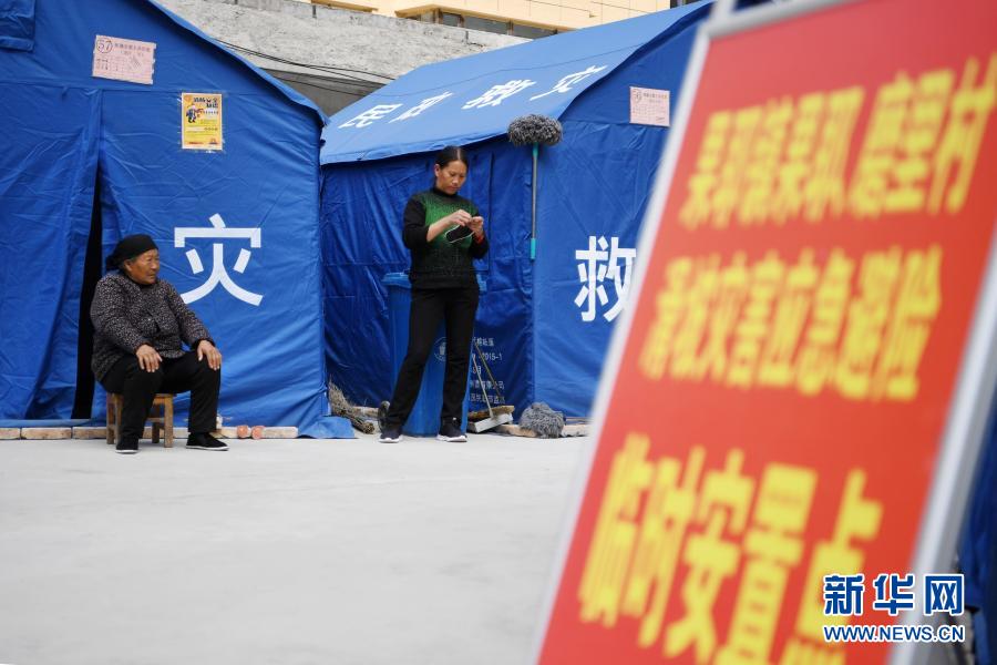 3月16日,在舟曲縣果耶鎮磨裏村、果耶村滑坡災害應急避險臨(lin) 時安置點,受災群眾(zhong) 在帳篷外做針線。新華社記者 範培珅 攝