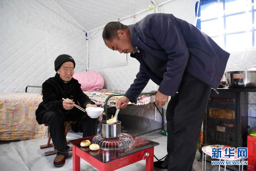 3月16日,在舟曲縣果耶鎮磨裏村、果耶村滑坡災害應急避險臨(lin) 時安置點,受災群眾(zhong) 在帳篷內(nei) 吃飯。新華社記者 範培珅 攝