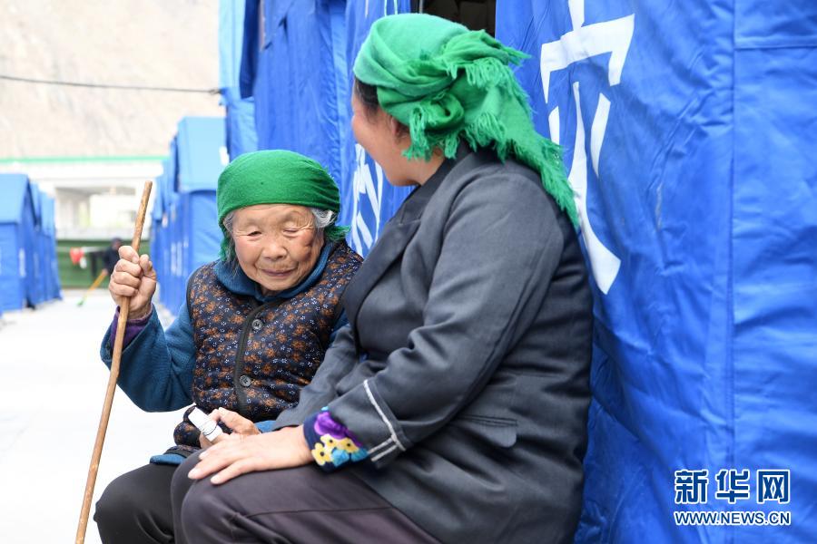 3月16日,在舟曲縣果耶鎮磨裏村、果耶村滑坡災害應急避險臨(lin) 時安置點,受災群眾(zhong) 在帳篷外聊天。新華社記者 範培珅 攝