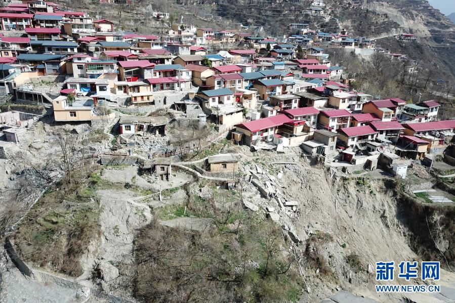 這是3月16日在舟曲縣果耶鎮磨裏村拍攝的滑坡中受損的民房(無人機照片)。新華社記者 範培珅 攝