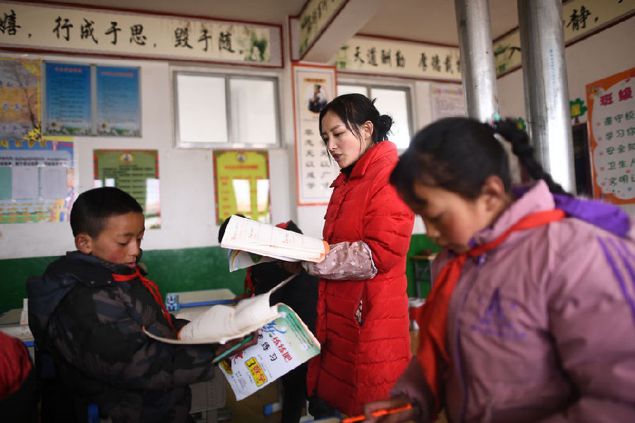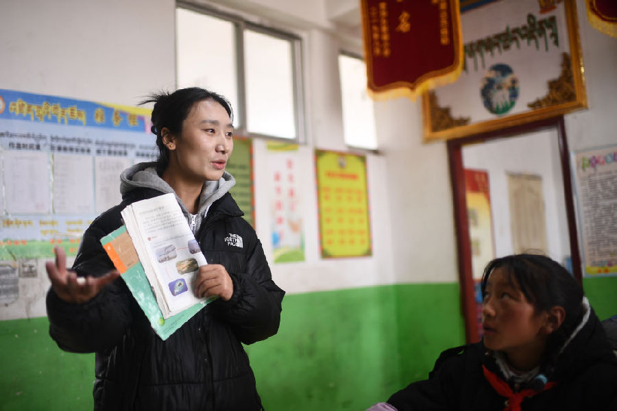 3月16日,索加鄉(xiang) 寄宿小學藏語文老師白瑪在為(wei) 學生授課。新華社記者 韓方方 攝