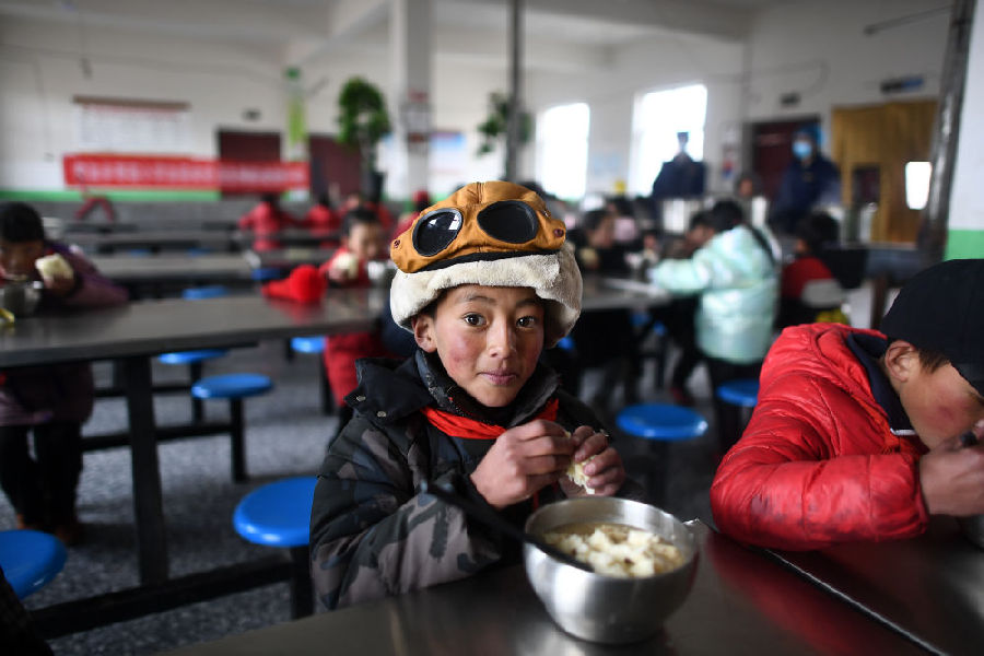 3月16日,在索加鄉(xiang) 寄宿小學食堂,格來達傑(前)在吃晚餐。新華社記者 韓方方 攝