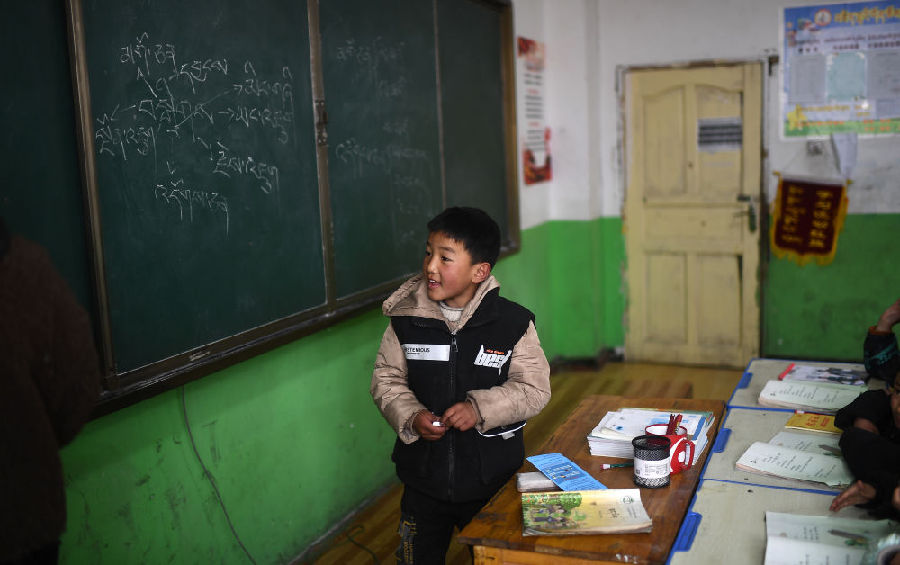 3月16日,索加鄉(xiang) 寄宿小學語文老師查日在為(wei) 學生上課。新華社記者 張宏祥 攝