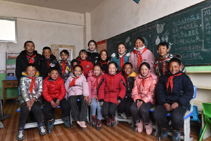 3月16日,在索加鄉(xiang) 寄宿小學,達哇才吉老師(後排中)和學生在一起。新華社記者 韓方方 攝