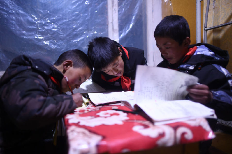 3月16日,在索加鄉(xiang) 寄宿小學,羅鬆東(dong) 丁(中)和小夥(huo) 伴在宿舍內(nei) 溫習(xi) 功課。新華社記者 張宏祥 攝