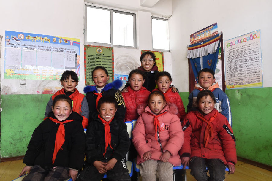 3月16日,在索加鄉(xiang) 寄宿小學,卓瑪才吉老師(後排中)和學生在一起。新華社記者 張宏祥 攝