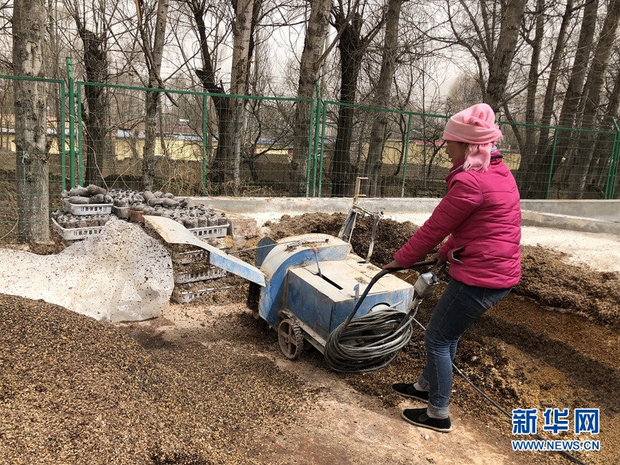 圖為(wei) 廖玉梅正在攪拌羊肚菌培養(yang) 基質。新華網 魚昊 攝