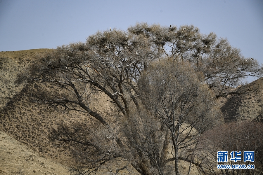 一群蒼鷺在貴德縣河東(dong) 鄉(xiang) 的一棵百年楊樹上嬉戲。新華網 潘彬彬 攝