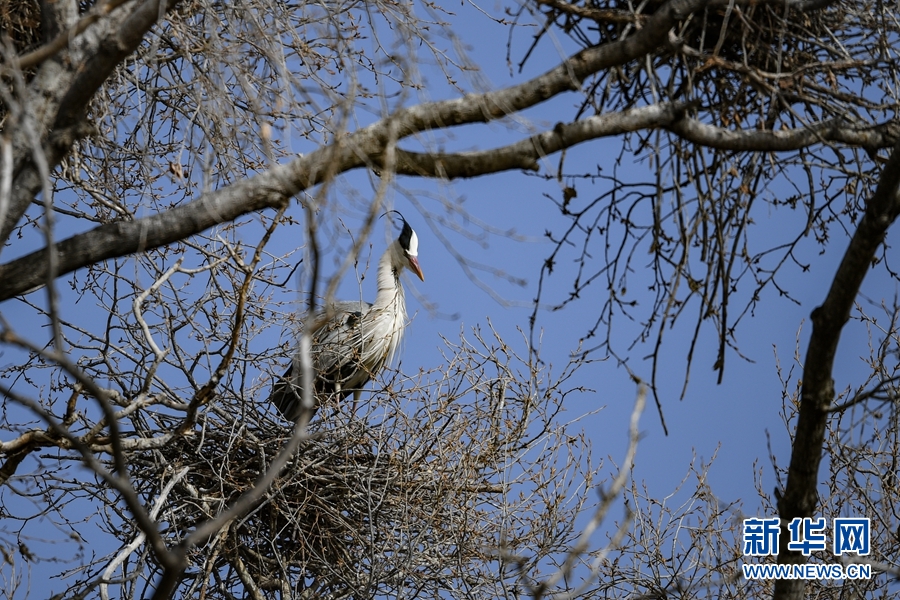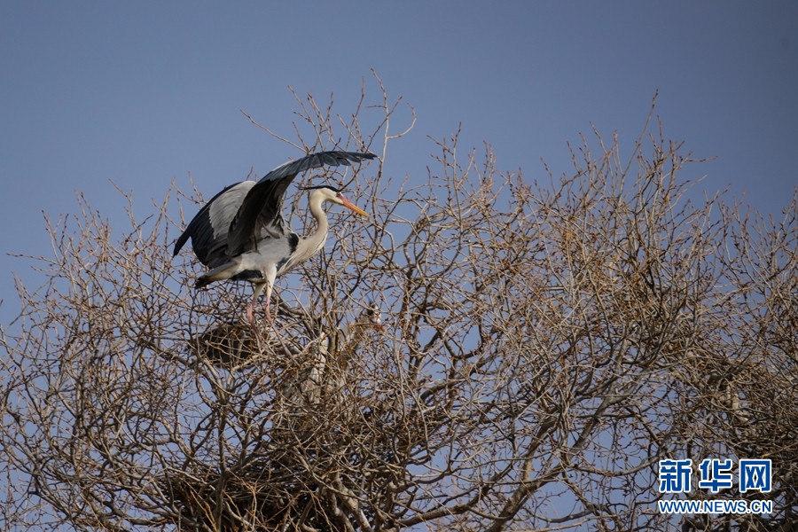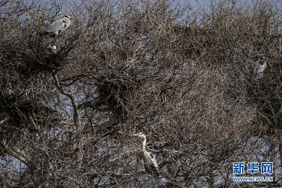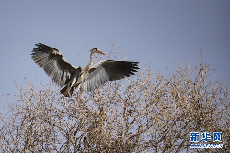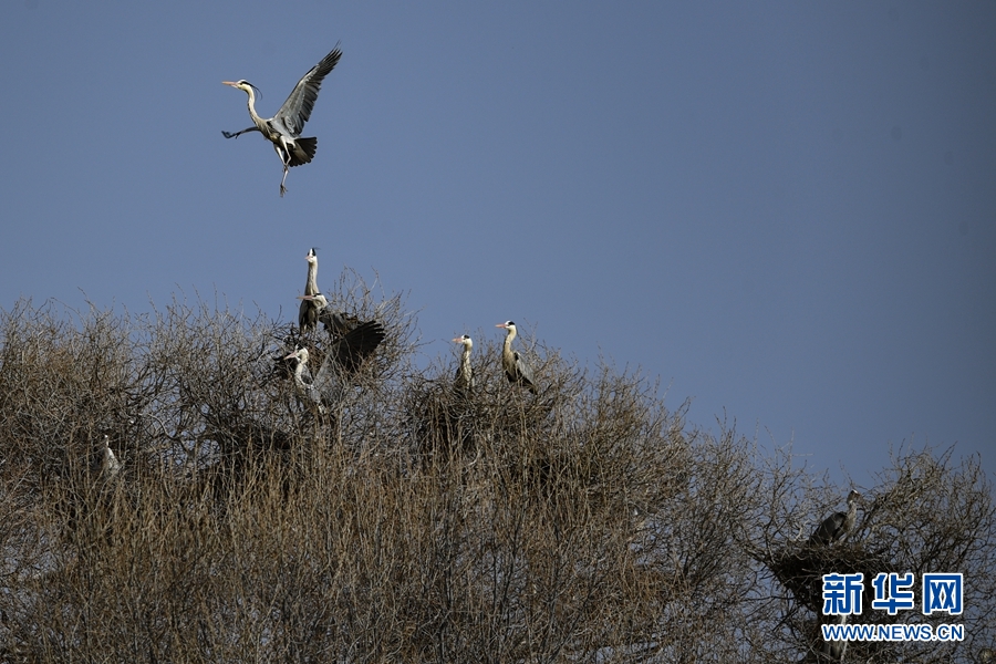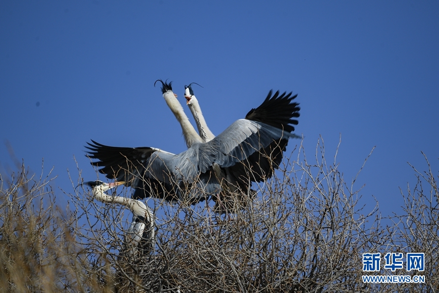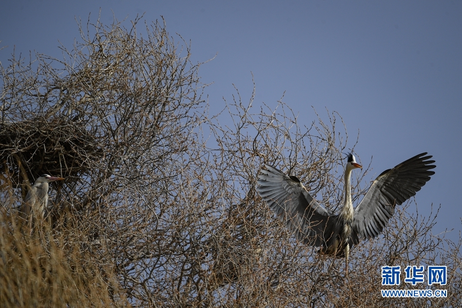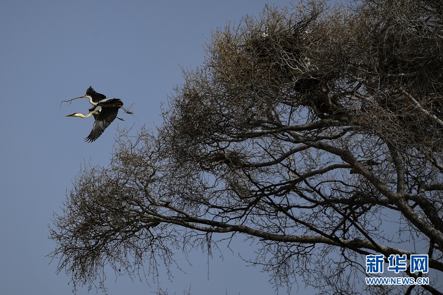 兩(liang) 隻蒼鷺來回飛舞忙碌建巢。新華網 卡婭梅朵 攝