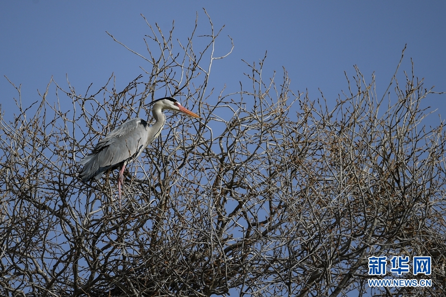 一隻蒼鷺站在樹梢上享受春日暖陽。新華網 卡婭梅朵 攝