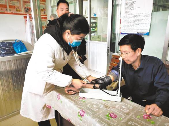 郭拉村衛生室村醫給村民量血壓。 李雪萌 攝
