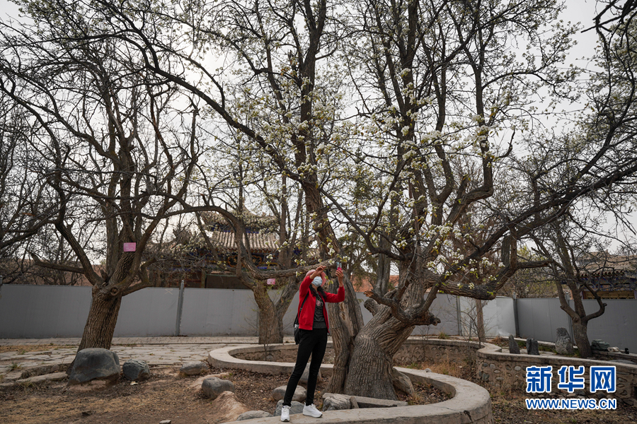 一名遊客在梨花樹下拍照。新華網 潘彬彬 攝