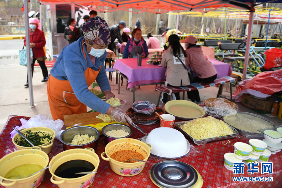 這兩(liang) 天的貴德縣格外熱鬧,一簇簇雪白的梨花競相綻放,引得許多“踏春人”來這裏“打卡”。在貴德縣水車廣場旁邊的小吃攤上,許元梅把一碗調好的釀皮端給顧客,忙完之後,她又給下一位顧客打包好一份酸奶。最近,貴德縣的遊客漸漸多了起來,休息了一個(ge) 冬天後,許元梅又支起了自己的小吃攤,為(wei) 過往遊客製作美食。