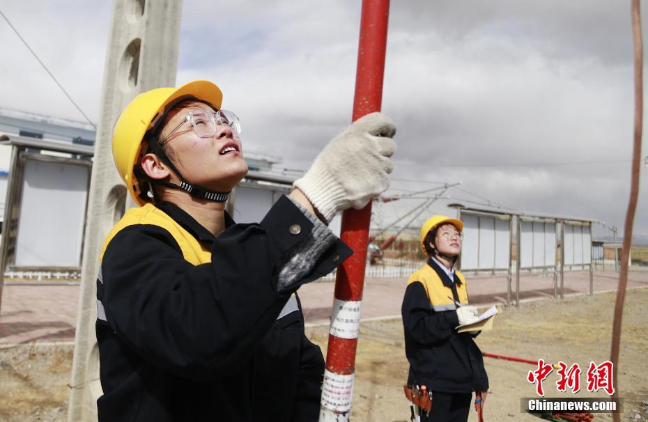 4月13日,青海省海北藏族自治州剛察縣,青藏鐵路公司西寧供電段哈爾蓋工區,羅露露(左)手舉(ju) 9米多長的地線杆向接觸網上掛地線。中新社記者 馬銘言 攝