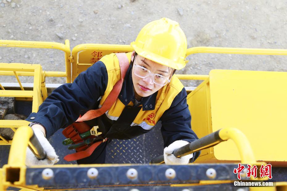 4月13日,青海省海北藏族自治州剛察縣,青藏鐵路公司西寧供電段哈爾蓋工區,羅露露攀爬接觸網作業(ye) 車。中新社記者 馬銘言 攝
