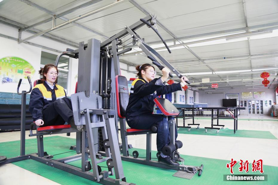 4月13日,青海省海北藏族自治州剛察縣,青藏鐵路公司西寧供電段哈爾蓋工區,郭勝強(左)與(yu) 羅露露一起健身鍛煉。中新社記者 馬銘言 攝