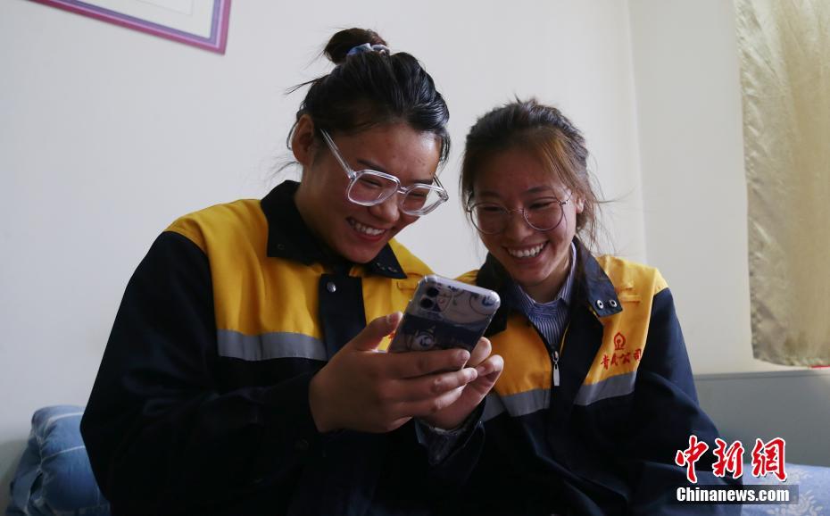 4月13日,青海省海北藏族自治州剛察縣,青藏鐵路公司西寧供電段哈爾蓋工區宿舍內(nei) ,羅露露(左)與(yu) 郭勝強在休息時間分享手機中的有趣內(nei) 容。中新社記者 馬銘言 攝