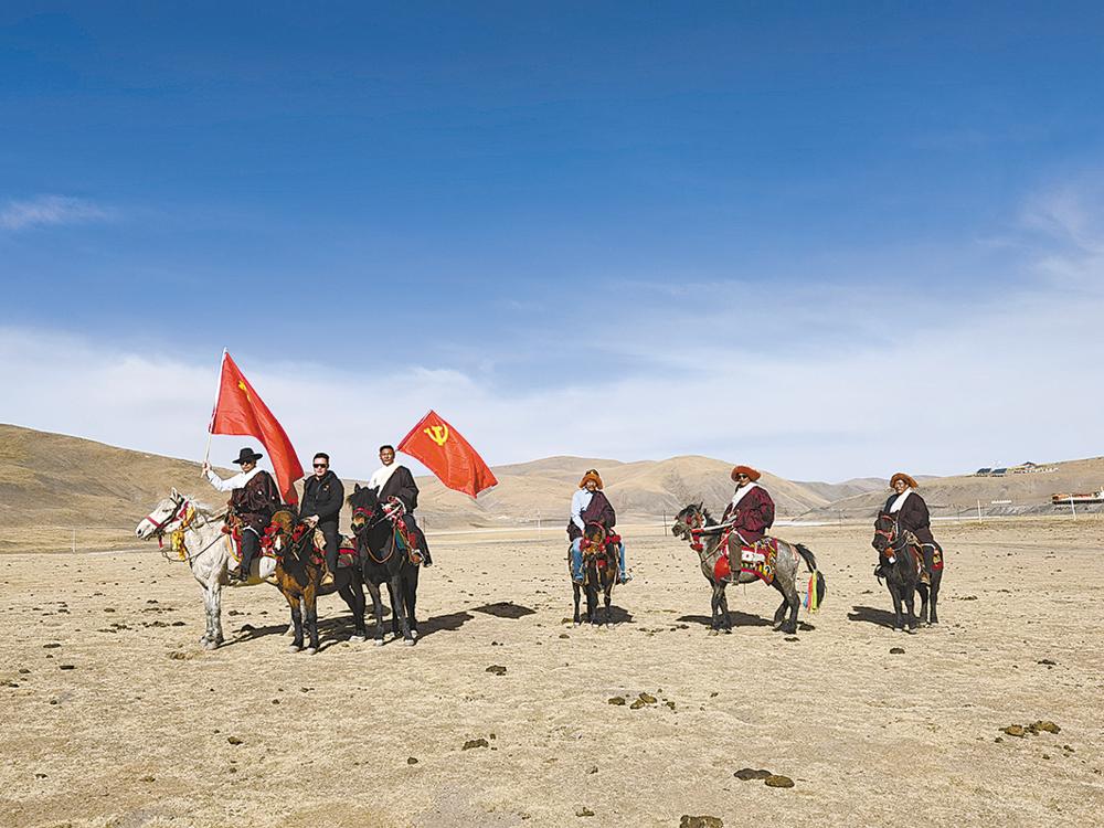 在玉樹藏族自治州曲麻萊縣葉格鄉(xiang) 龍麻村,一陣馬蹄聲由遠而近,牧民江措趕忙放下手中的活從(cong) 帳篷裏探出頭來,定睛一看,幾個(ge) 熟悉的身影進入視線。走在最前麵的幹部手拿一麵鮮紅的黨(dang) 旗隨風飄動,江措激動地向大家打起了招呼。