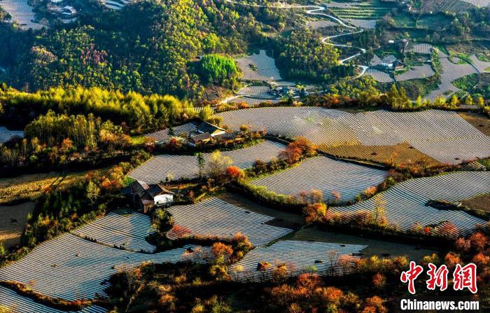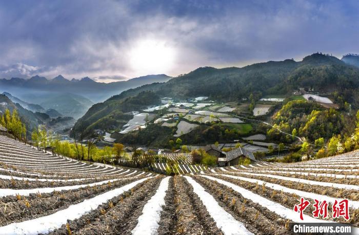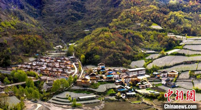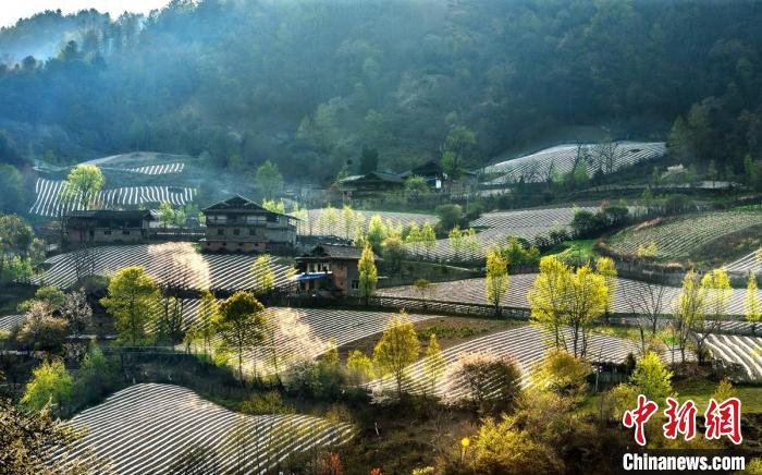4月的四川雅安市寶興(xing) 縣磽磧藏族鄉(xiang) ,山坡上整齊有序的地膜,錯落有致鋪在藏寨林間,構成了一幅田園山水與(yu) 天人合一的自然畫卷。