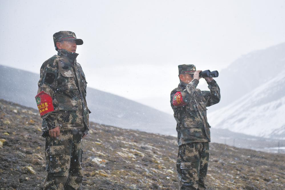 4月23日,祁連山國家公園沙龍灘管護站生態管護員羅藏次成(右)在巡護途中使用望遠鏡監測野生動物。新華社 吳剛 攝
