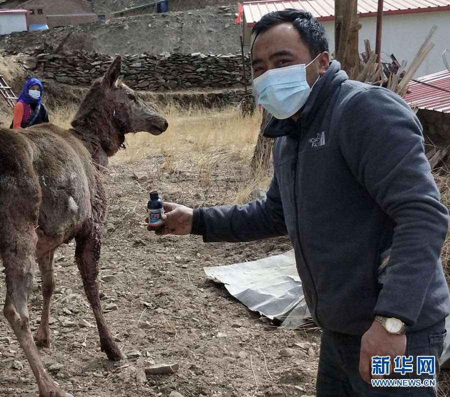 圖為(wei) 護林員給救助的馬鹿上藥。(圖片由瑪沁縣東(dong) 傾(qing) 溝鄉(xiang) 政府提供)
