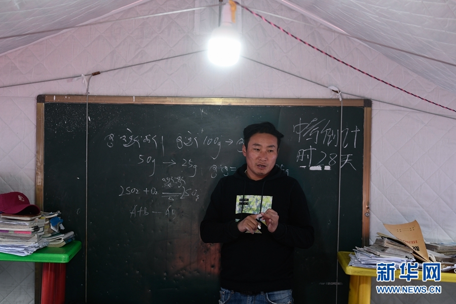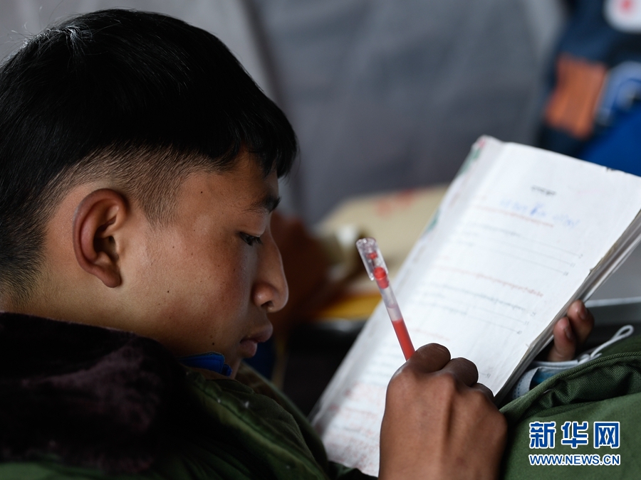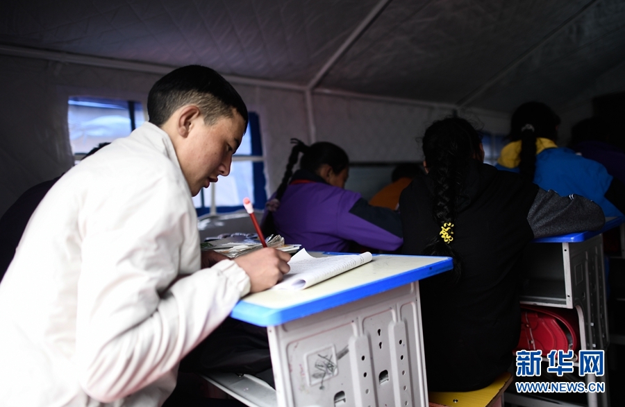 5月23日,瑪多縣民族寄宿製中學學生在帳篷教室上課。新華社記者 張龍 攝