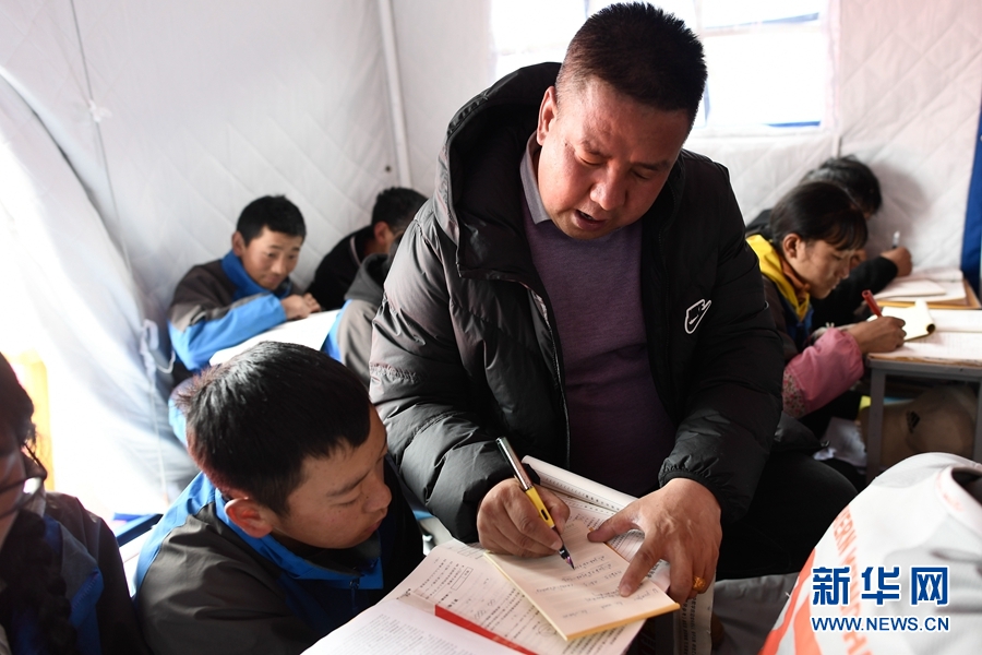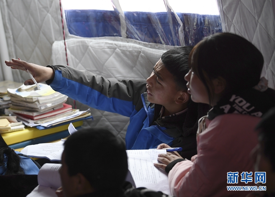 5月23日,瑪多縣民族寄宿製中學九年級老師李加才仁在課堂上輔導學生。新華社記者 張龍 攝