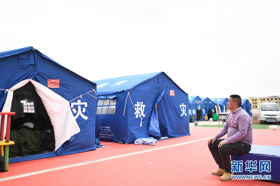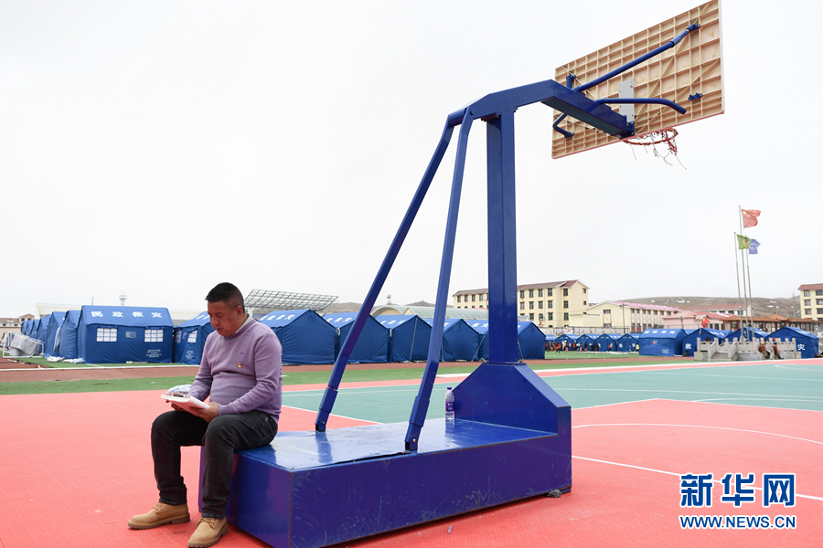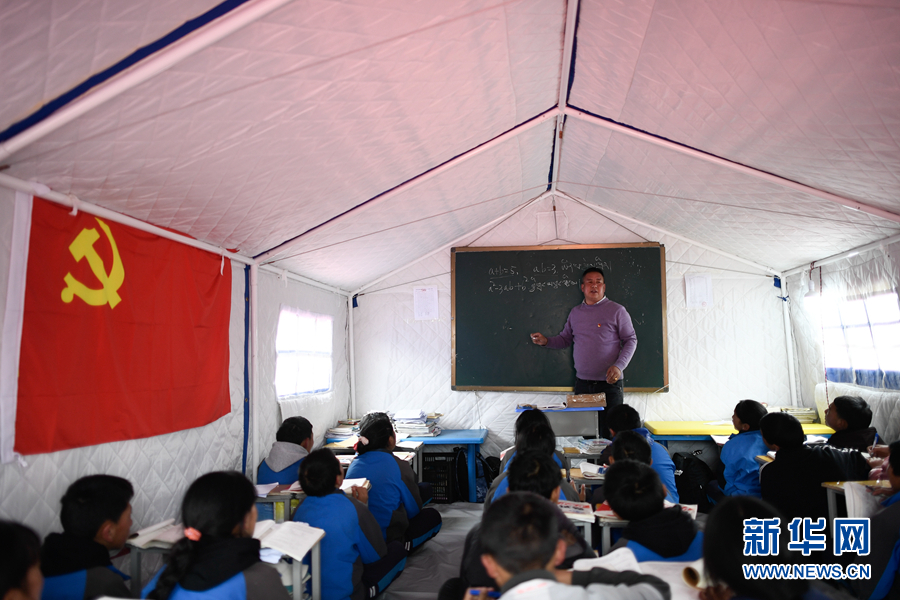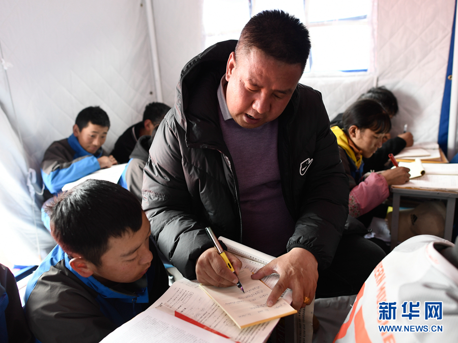 5月23日,李加才讓在帳篷教室裏給學生輔導功課。新華社記者 張龍 攝