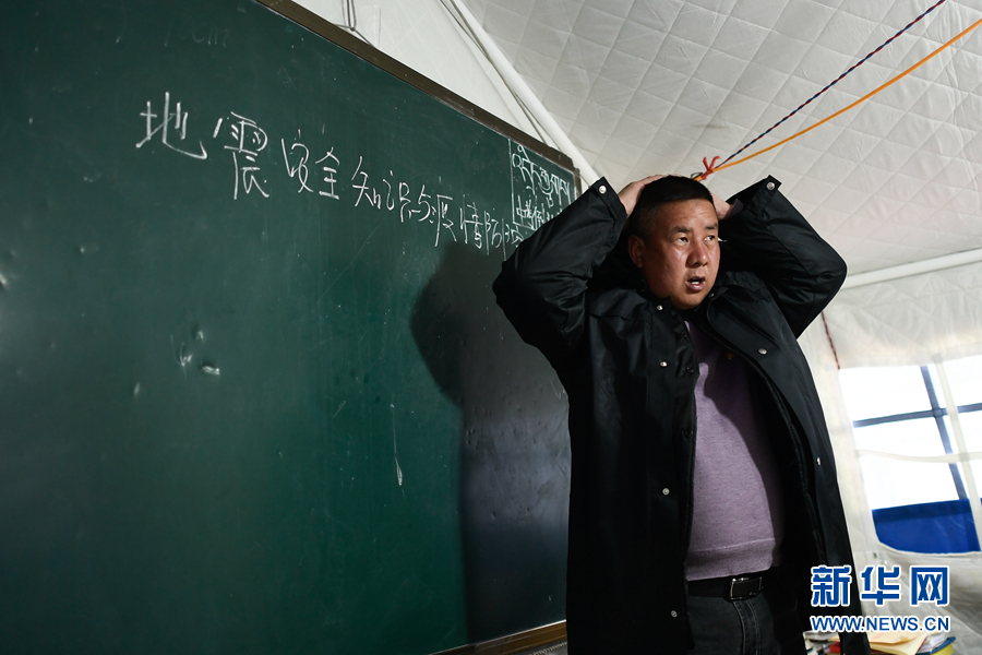 5月23日,李加才讓在九年級二班的主題班會(hui) 上講解地震逃生知識。新華社記者 張龍 攝