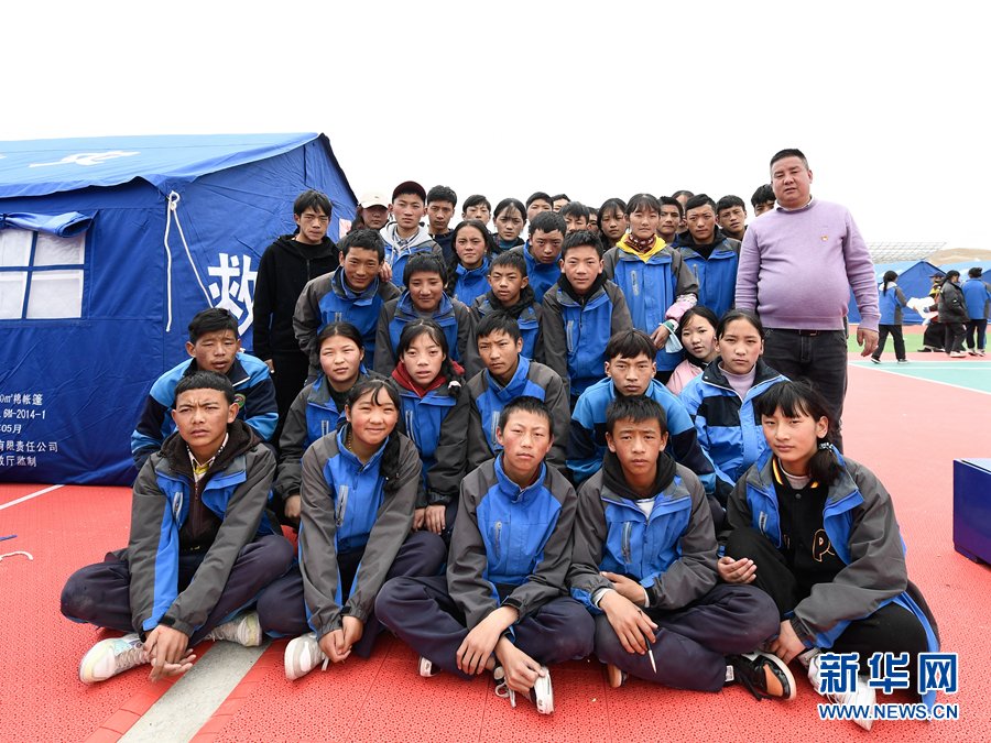 5月23日,李加才讓和學生們(men) 在瑪多縣民族寄宿製中學帳篷教室旁合影。新華社記者 張龍 攝