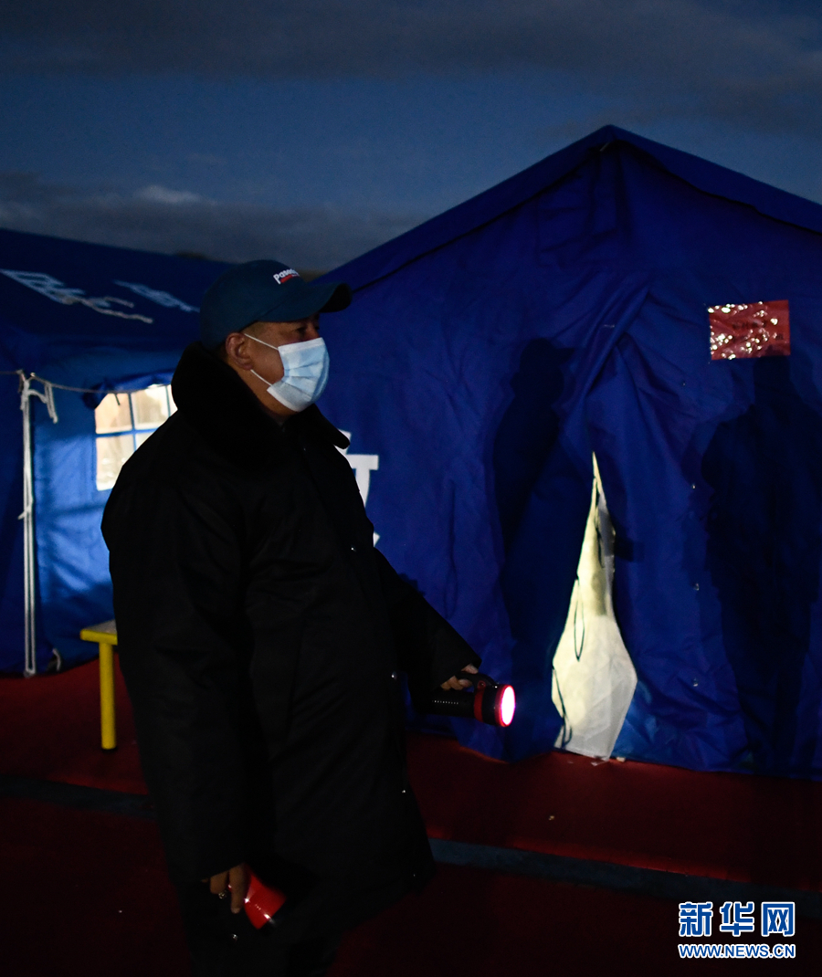 5月23日夜間,李加才讓在瑪多縣民族寄宿製中學操場的學生營地巡查。新華社記者 張龍 攝