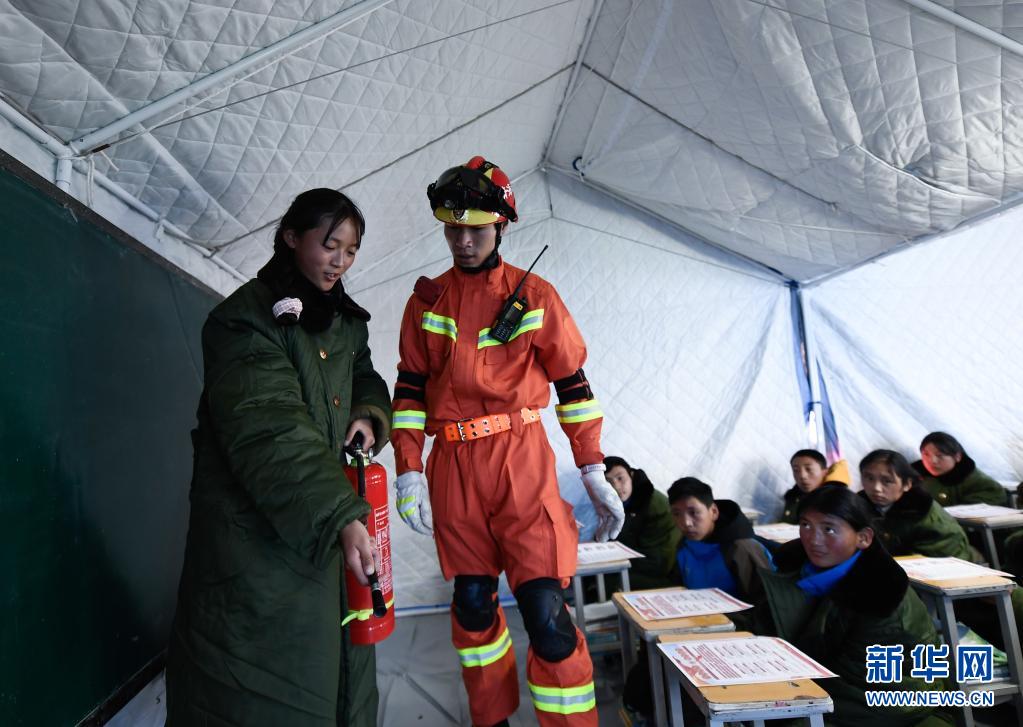 5月24日,青海果洛州消防救援支隊隊員在指導曲邁卓瑪(左一)學習(xi) 防災避險知識。新華社 張龍 攝
