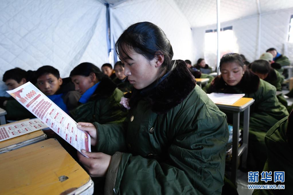 5月24日,曲邁卓瑪在瑪多縣民族寄宿製中學帳篷教室裏學習(xi) 防災避險知識。新華社 張龍 攝