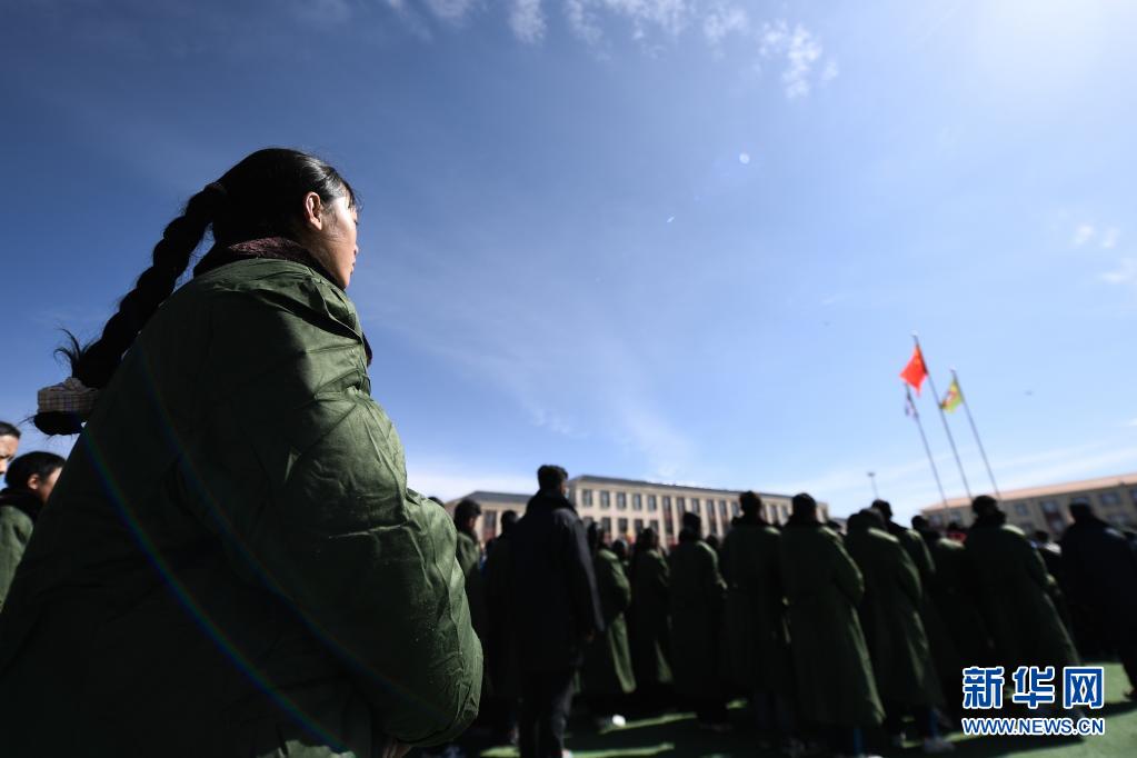 5月24日,曲邁卓瑪(左一)在瑪多縣民族寄宿製中學參加升旗儀(yi) 式。新華社 張龍 攝